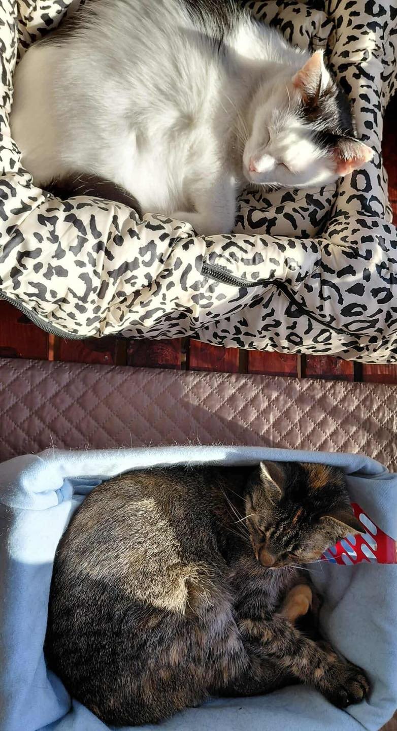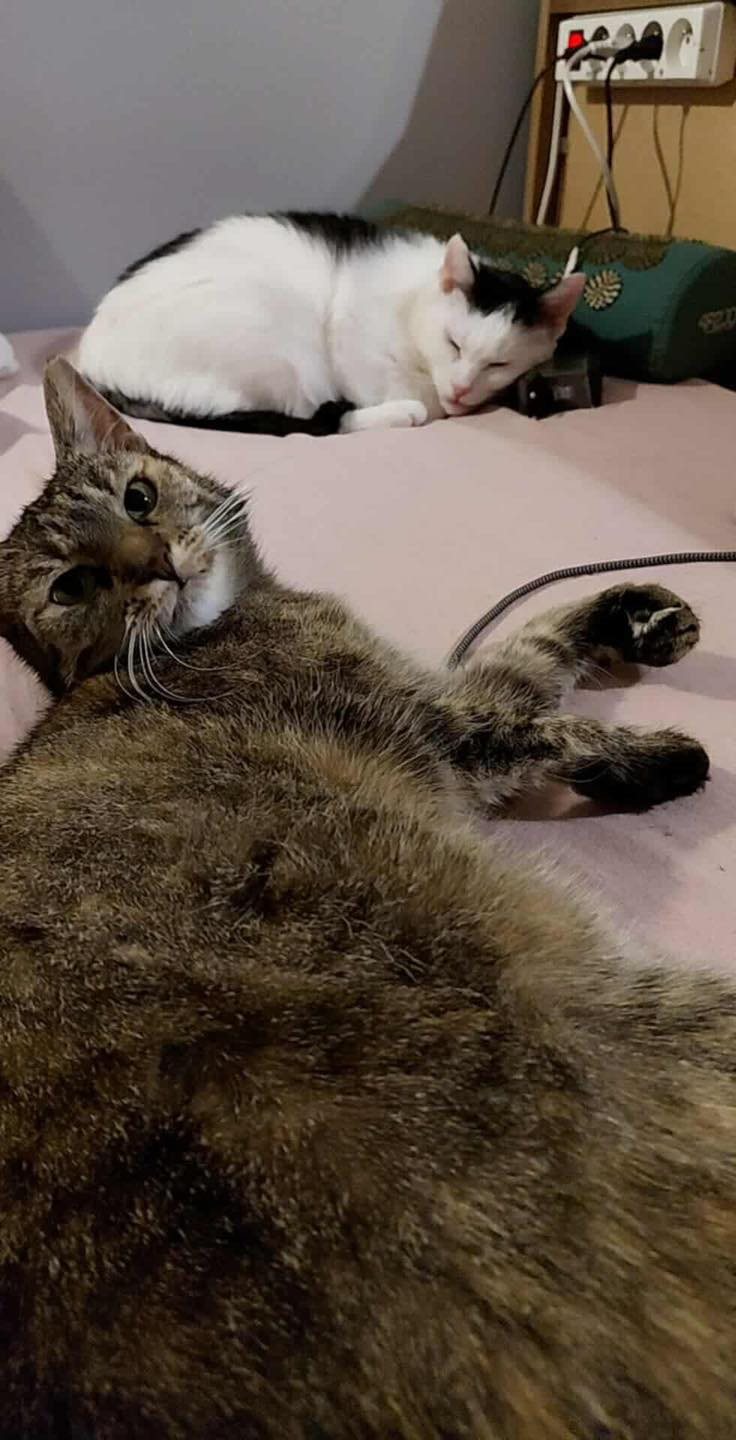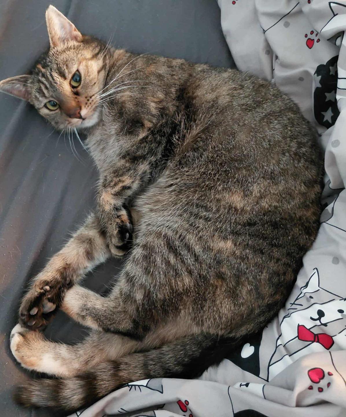 „Cześć Ciocie! Z tej strony fundacyjna Burka, teraz Żbikulka 🐱 Zastanawiam się czy ktoś jeszcze o mnie pamięta 🙂 Dzisiaj mam drugie adopciny, czas leci jak szalony. Przez ostatnie pół roku przeszłam totalną przemianę. Już wiem, że to jest mój domek i nikt mnie nie zostawi. Zaczęłam ugniatać mamę łapkami, jeszcze przez kołdrę, ale wszystko przed nami 😀 Codziennie rano przybiegam po porcję głasków i nawet przytulam się do mamy (przesyłam zdjęcie, bo nikt mi nie uwierzy). Czasami głośno krzyczę na mamę, szczególnie jak widzę w jej ręku saszetę 😃 Co do chorej nogi, to nikt mi już nie wierzy, że miałam operację, bo skaczę jak kozica z moim przyrodnim bratem 😃 Przesyłam ostatnie zdjęcia i pozdrawiam razem z całą rodziną”.