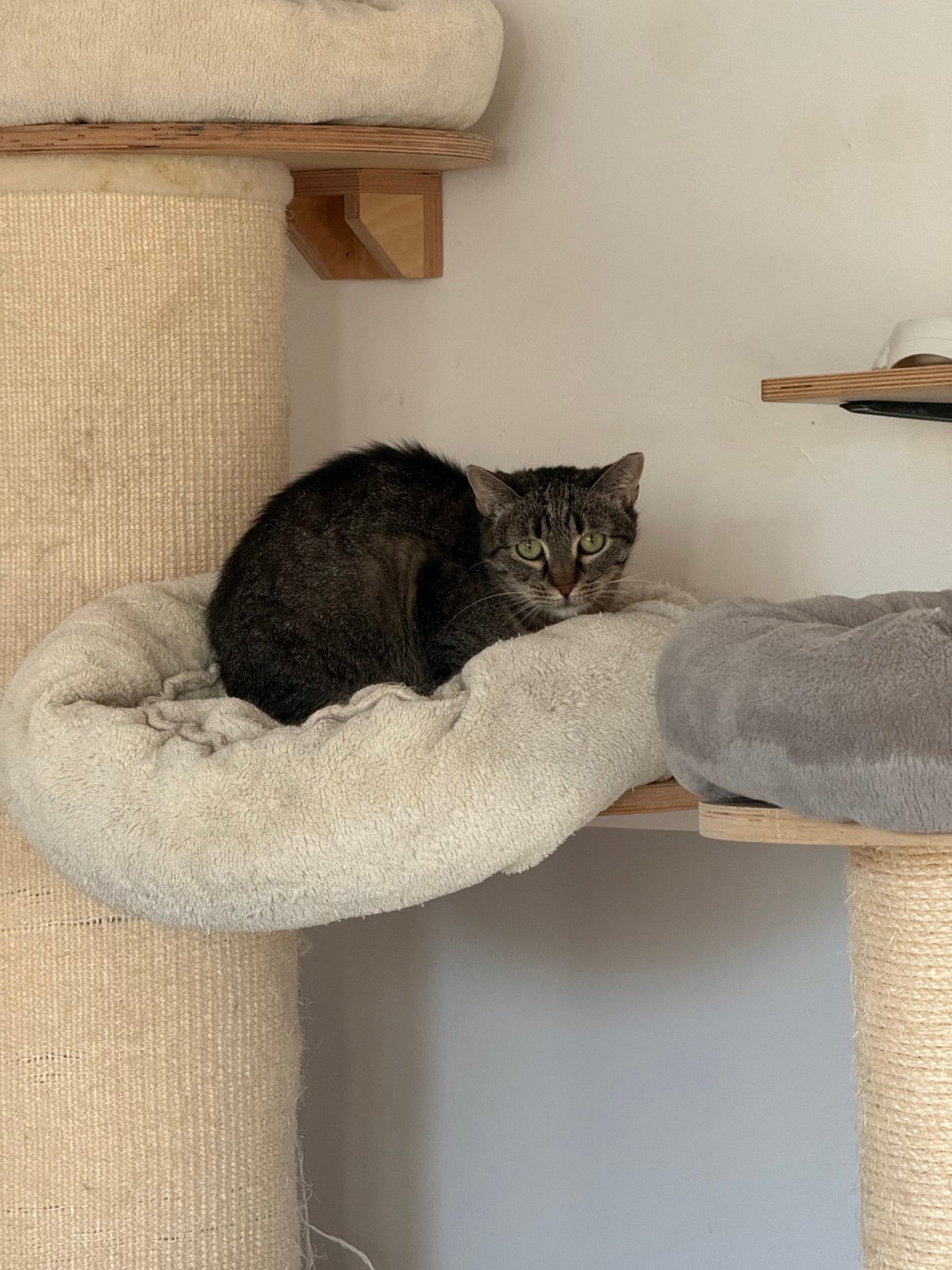 W innym pokoju zamieszkała Domiś. Ze względu na utrzymujące się u niej biegunki po niektórych karmach, została przeniesiona do pomieszczenia, w którym koty są na diecie jelitowej. Dzięki temu możemy ściśle kontrolować, co je i jak reaguje na poszczególne karmy. Domiś jest obecnie kotką w dużej mierze oswojoną – wciąż delikatnie nieśmiała, wymagająca spokojnego podejścia, ale bardzo lubiąca głaskanie i obecność człowieka. To niezwykle sympatyczna, łagodna i urocza kotka, która naprawdę dobrze rokuje na przyszłość. Mamy ogromną nadzieję, że uda się jej w niedługim czasie znaleźć bezpieczny, kochający dom 🏠