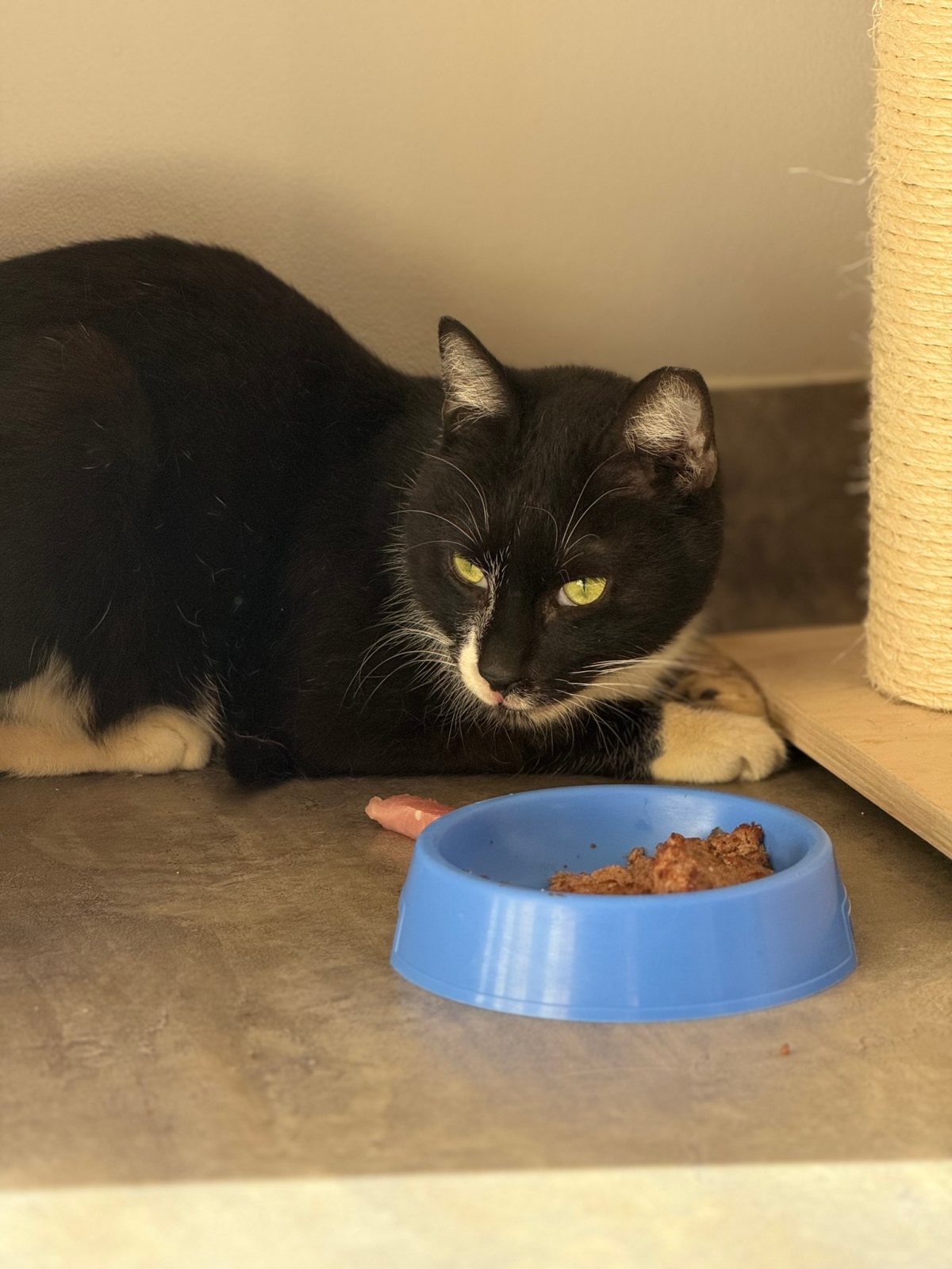 Nieco lepiej radzi sobie Teodor. Choć nadal lubi zgrywać groźnego kocura, robi widoczne postępy. Jesteśmy już w stanie delikatnie go pogłaskać – oczywiście po wcześniejszym przekupieniu smakołykiem 😉 W nowym pokoju funkcjonuje całkiem dobrze, choć przy wejściu człowieka wciąż zachowuje czujność. Niestety Teodor złapał ostatnio panującego w Mruczarni kaliciwirusa. Na szczęście jako starszy, wcześniej szczepiony kot z wykształconym układem odpornościowym przechodzi infekcję dość łagodnie. Nie stracił apetytu, dostaje leki przeciwzapalne i wspierające odporność i wszystko wskazuje na to, że szybko uporamy się z wirusem 💪