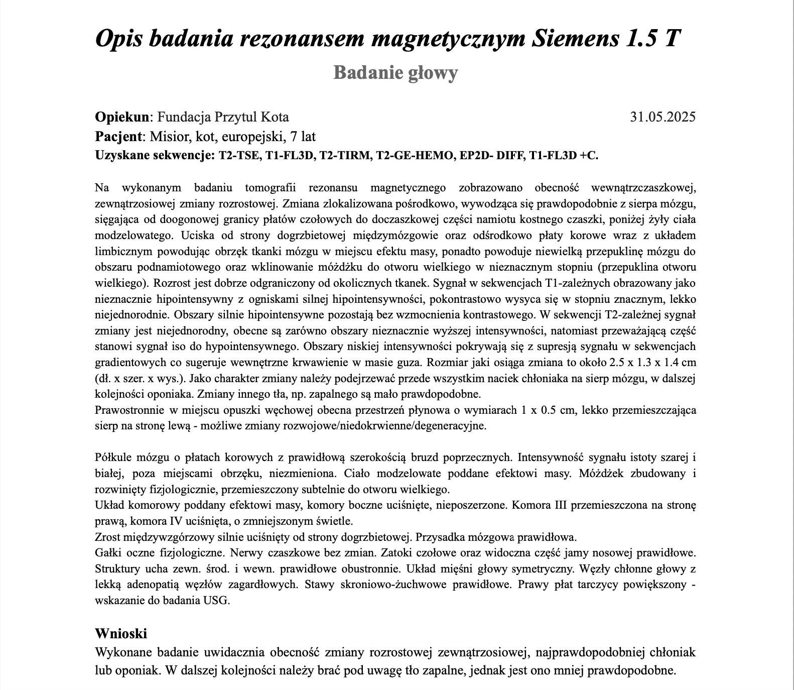 Badanie wykazało obecność wewnątrzczaszkowej zewnątrzosiowej zmiany rozrostowej, która wywiera ucisk na mózg. To najprawdopodobniej chłoniak lub oponiak. Guz jest nieoperacyjny, jedyne, co możemy robić, to leczyć Misiora zachowawczo tak długo, jak długo będzie na terapię reagował…