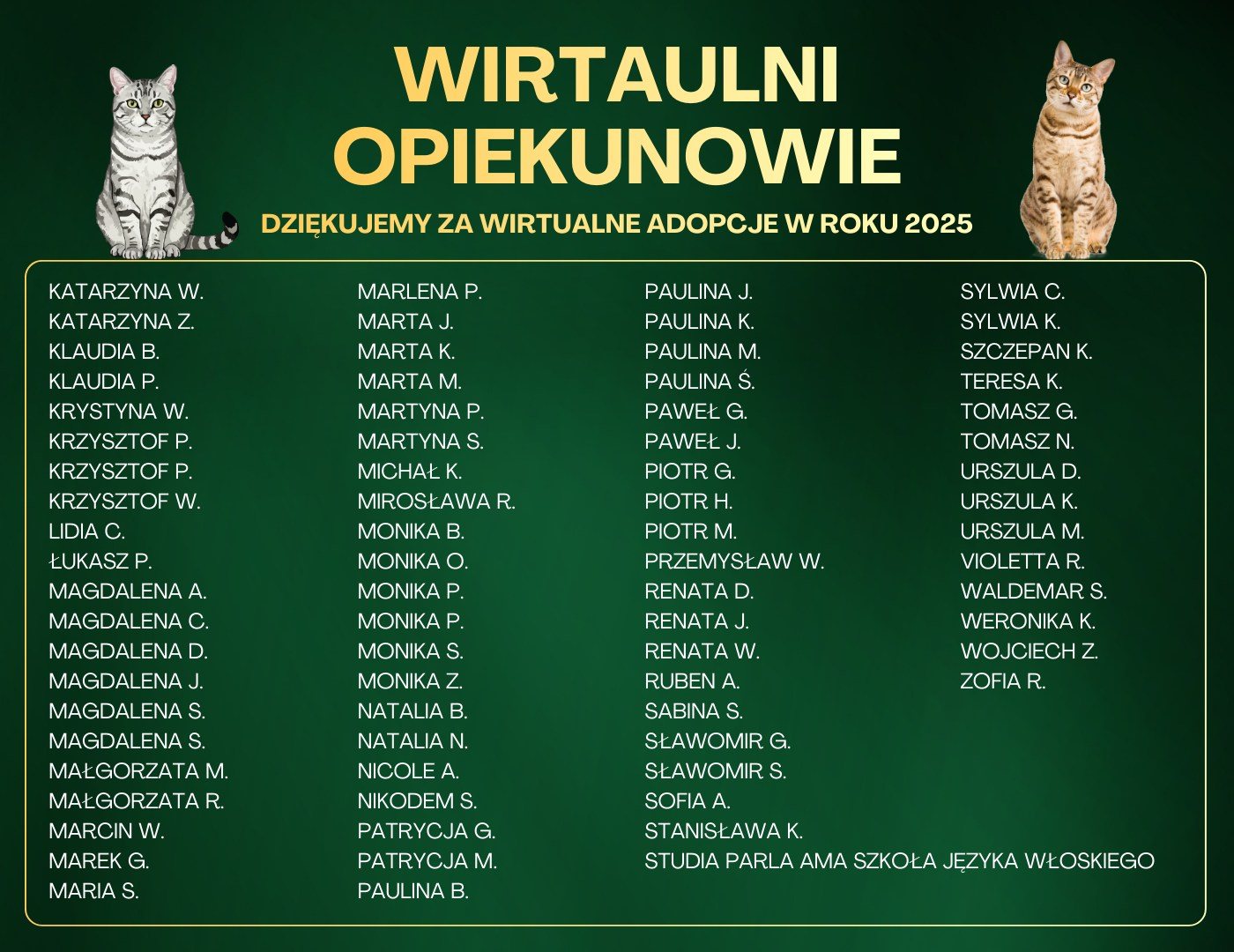 W 2025 roku towarzyszyło nam aż 159 wspaniałych osób i firm. Dziękujemy za hojność, za zaufanie i za to, że los bezdomnych kotów nie jest Wam obojętny 🐱✨ Bez Was byłoby nam nieprawdopodobnie trudno.