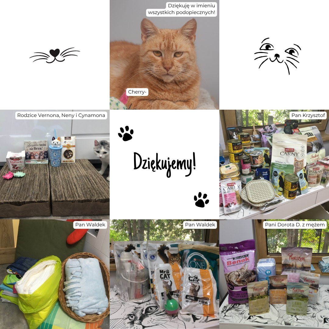 🐱Pani Dorocie D. i jej mężowi, za pyszności dla kocich brzuszków, niezbędne podkłady higieniczne i żwirek – który zużywamy w ilościach hurtowych! Dziękujemy za ogromne serce! 😻