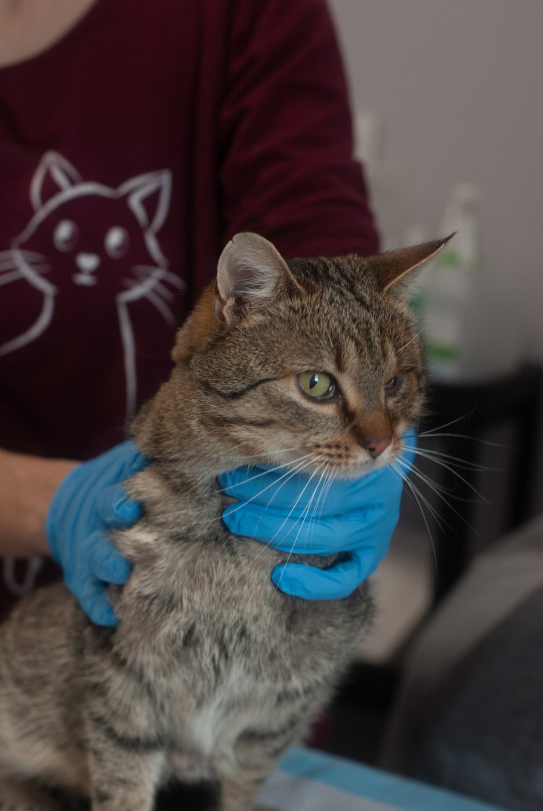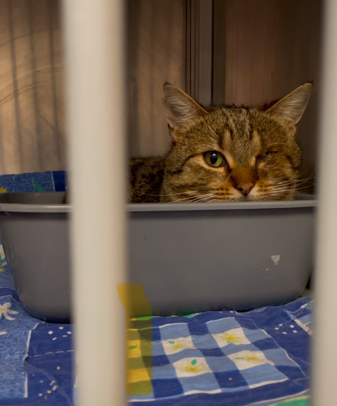 Poza brakiem oczka, kocurek jest zdrowy. Szykujemy go do kastracji, w międzyczasie zaś został już zaszczepiony i odrobaczony, przeprowadziliśmy ponadto podstawowe badania 🩸💉 Na chwilę obecną odbywa obowiązkową kwarantannę – widać, że pobyt w klatce go stresuje, ale liczymy, że gdy tylko możliwe będzie przeniesienie go na salony Mruczarni, poczuje się lepiej i pewniej.