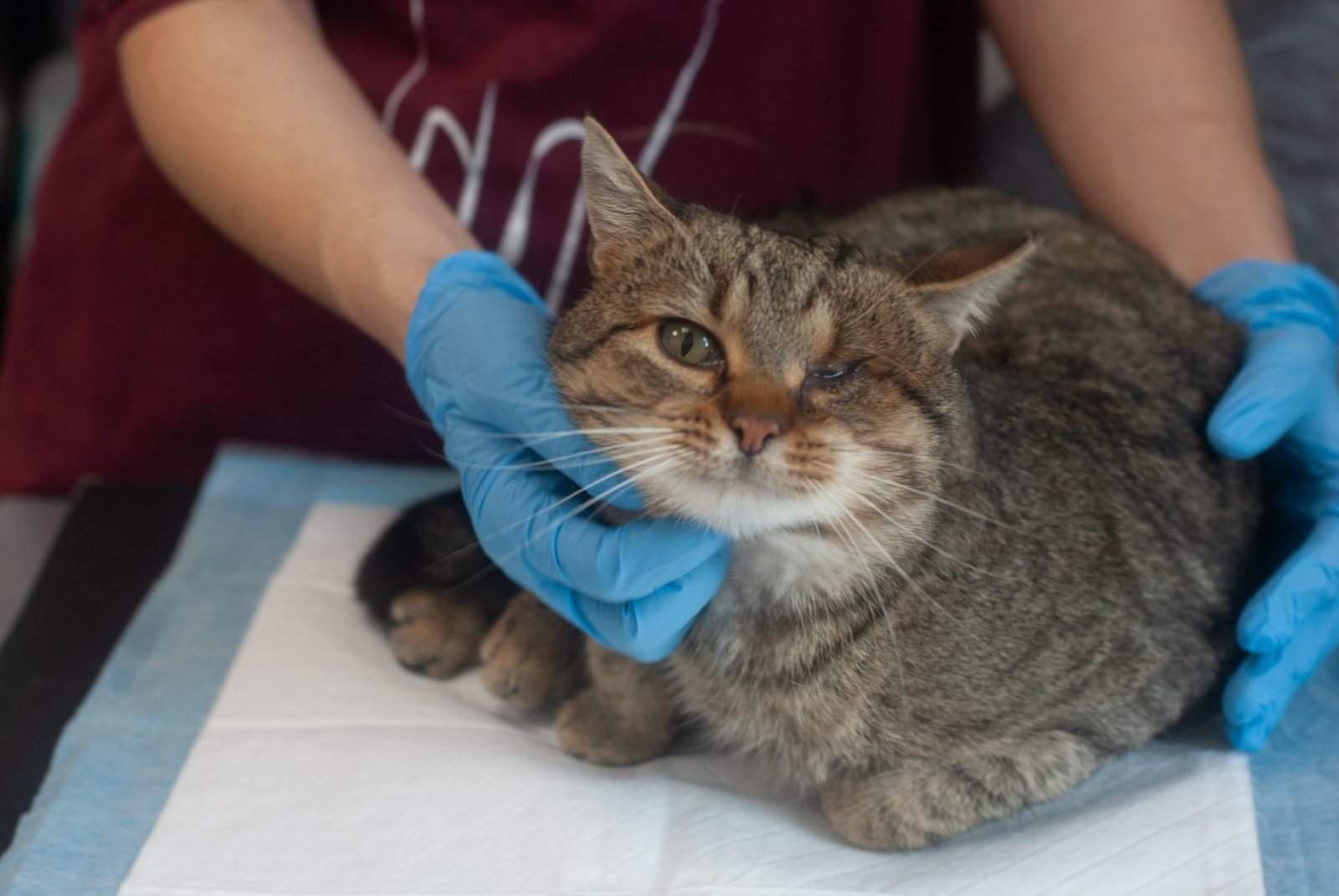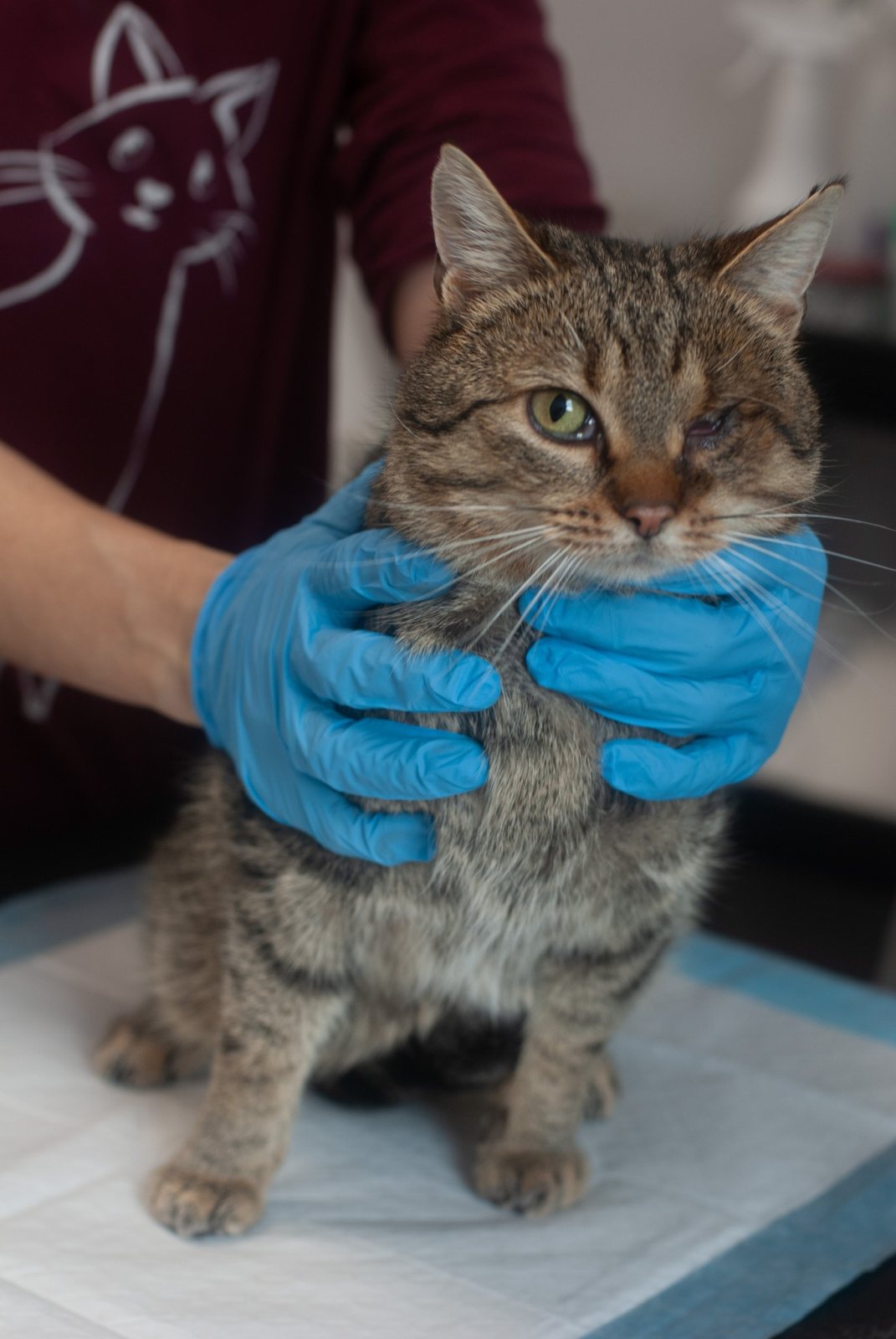 Zastanawiacie się pewnie, co stało się z oczkiem Smerka? 😢 Niestety, stracił je na skutek kociego kataru przebytego w dzieciństwie 😔 Z tego powodu konieczny jest zabieg wyczyszczenia oczodołu z ewentualnych pozostałości po gałce ocznej, a następnie plastyka powieki, podczas której otwór zostanie zaszyty, by nie narażać tego obszaru na infekcje.