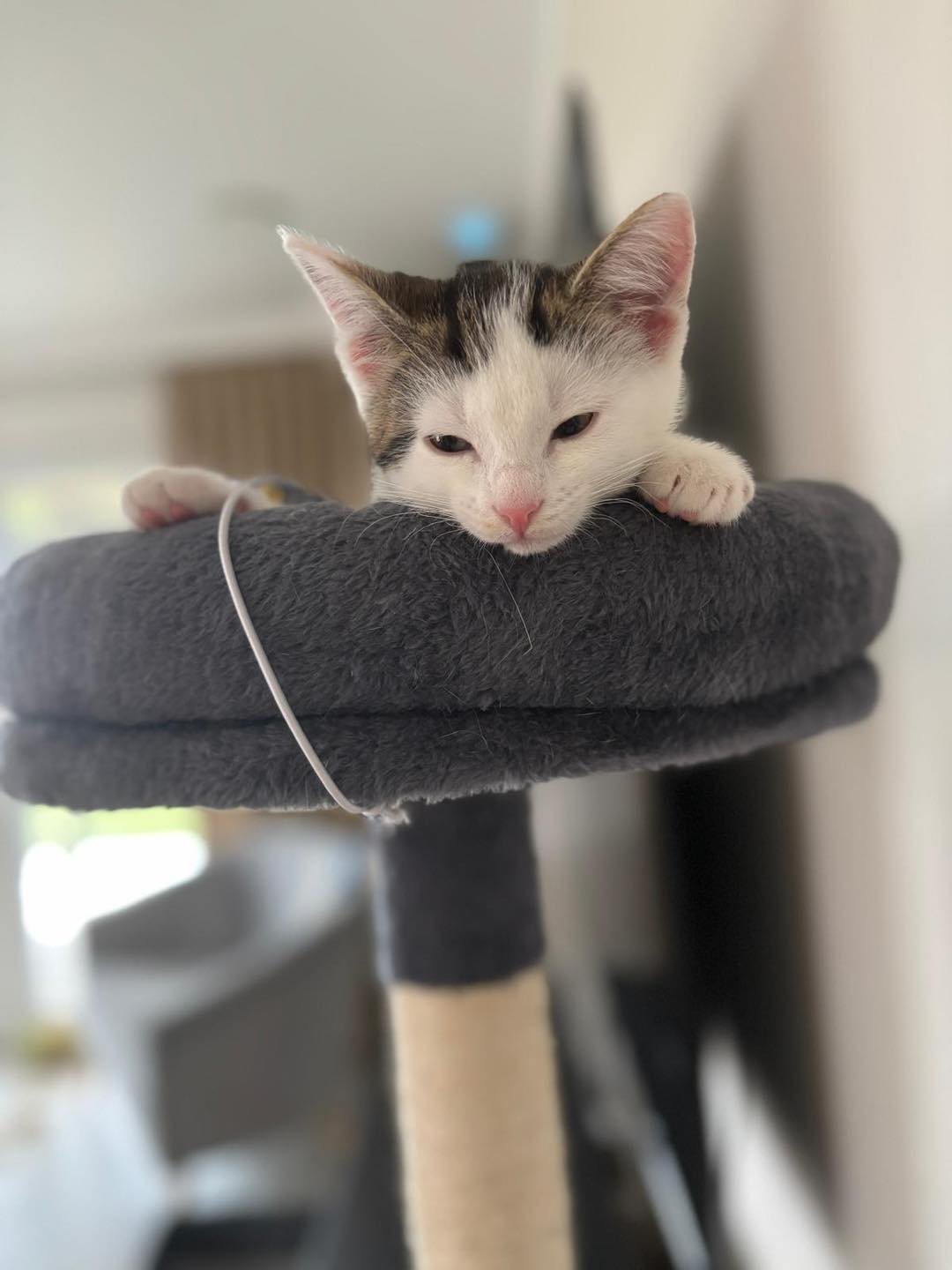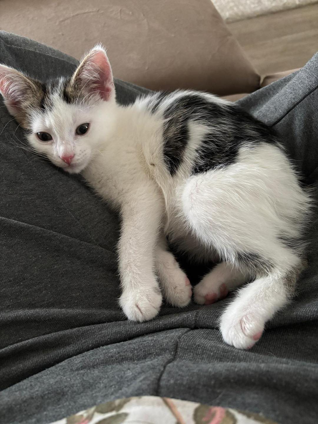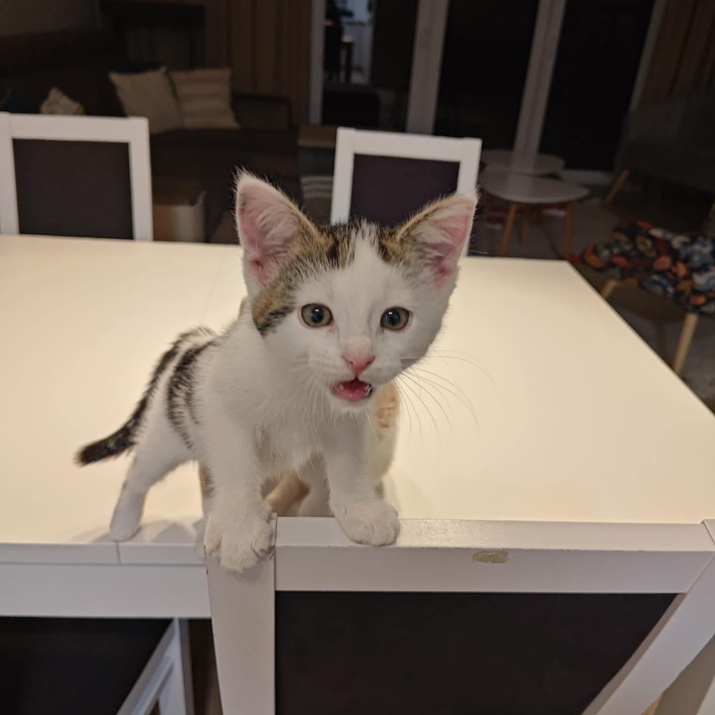 Chałka ma nieco ponad dwa miesiące. Jest mniejsza i delikatniejsza od swojego brata, a do tego potrzebuje odrobinę więcej czasu, żeby zaufać człowiekowi. Lubi głaski, ale na ten moment najważniejsza jest dla niej zabawa — wszelkie wędki, piłeczki i koci ferwor po prostu wygrywają 😸