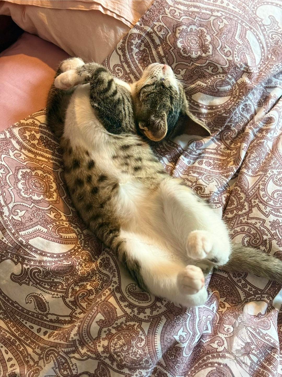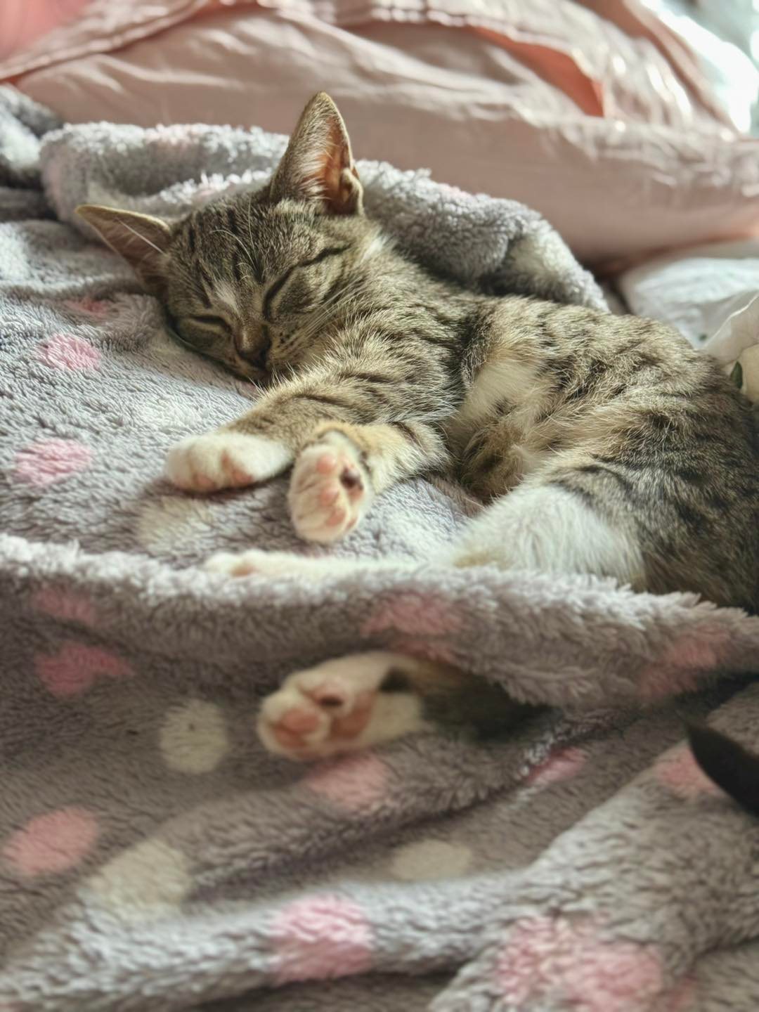 Stevie, jak to maluchy w jego wieku, kocha zabawę, ale widać, że – zwłaszcza w porównaniu z siostrą – będzie kotkiem nieco spokojniejszym i zrównoważonym 🧘. Brak wzroku nie przeszkadza mu w życiu codziennym – czasem jeszcze zdarza mu się niechcący wejść w jakąś przeszkodę na drodze, ale gdy zaczyna polowanie na wędki czy piłeczki, wykazuje się świetnymi zdolnościami łowieckimi i precyzyjnymi ruchami 😺. Lubi towarzystwo starszych kotów, ale takich, które jawnie okazują mu troskę i chcą się nim zaopiekować. Tymczasowej opiekunce pozwala na czułości i sam często przychodzi się przytulić, jednak w okazywaniu uczuć jest nieco mniej wylewny i entuzjastyczny, niż Wonder.