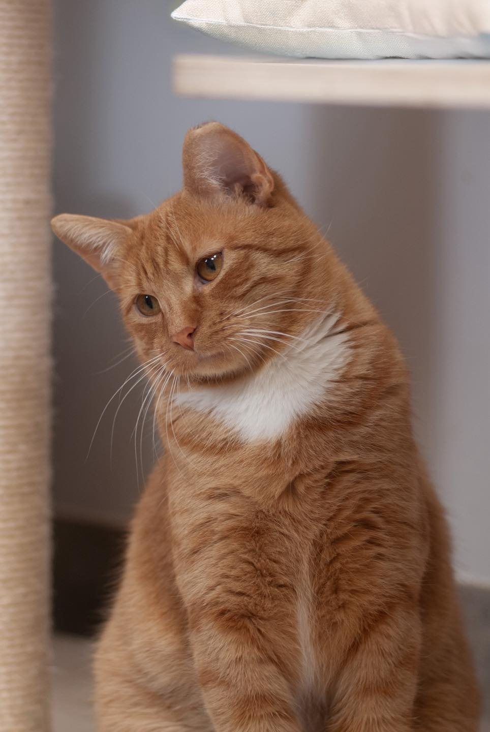 Szymon wyraźnie jest ciekawy ludzi 😊 Pozwala się głaskać, ale nadal zachowuje pewien dystans. To kot, który potrzebuje cierpliwości, spokojnego podejścia i pracy ze strony opiekuna, by skrócić ten dystans. Wierzymy jednak, że ma w sobie ogromny potencjał na prawdziwego miziaka — wystarczy odpowiednia osoba i trochę czasu 🧡