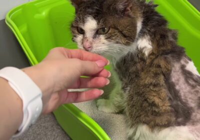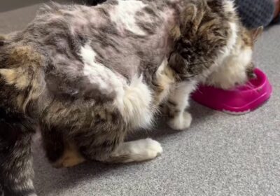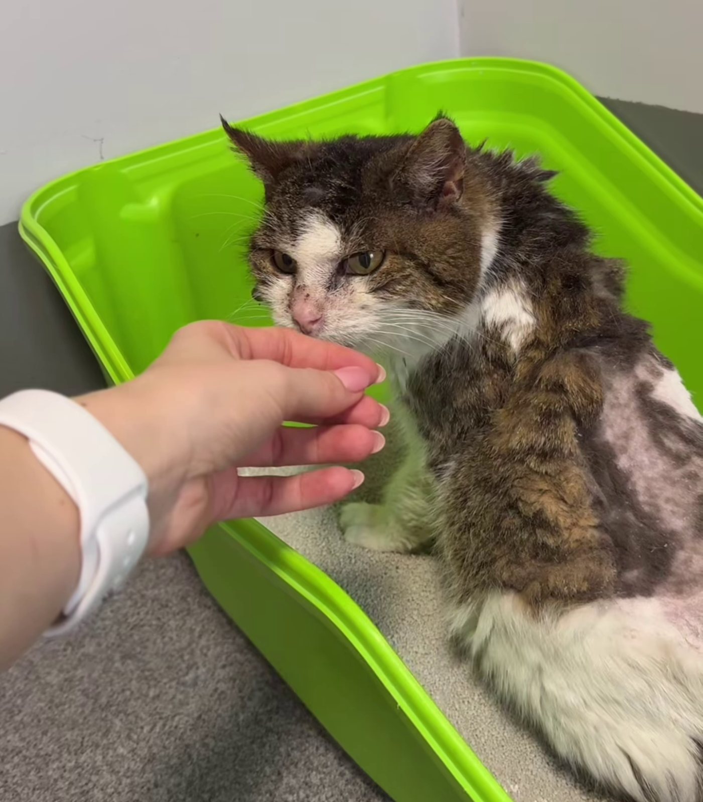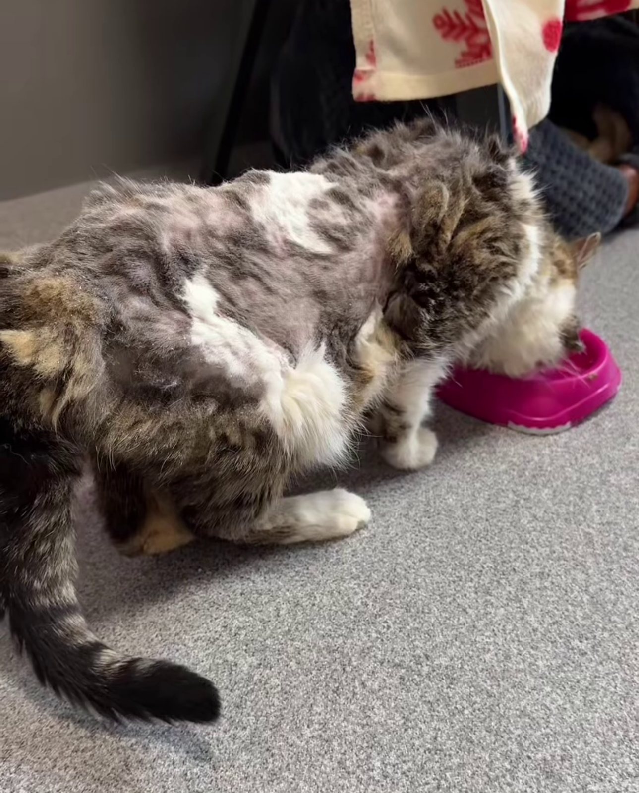 Nie wszystko jednak przychodzi łatwo. Jej sierść była jedną wielką skorupą z kołtunów. Nie mamy innego wyjścia niż strzyżenie, ale Terka bardzo źle znosi te zabiegi. Maszynka szybko się nagrzewa, kołtuny są potężne, a sama koteczka – krucha, sama skóra i kości. Walczy, kręci się, krzyczy, dlatego musimy bardzo uważać, by przytrzymując ją, przypadkiem nie zrobić jej krzywdy. Z tego powodu zdejmujemy tę „zbroję” partiami, małymi kroczkami. Efekt na razie jest daleki od ideału – sierść jest zgolona nierówno, a wygląd Terki pozostawia sporo do życzenia – ale jej bezpieczeństwo jest dla nas ważniejsze niż estetyka 😔