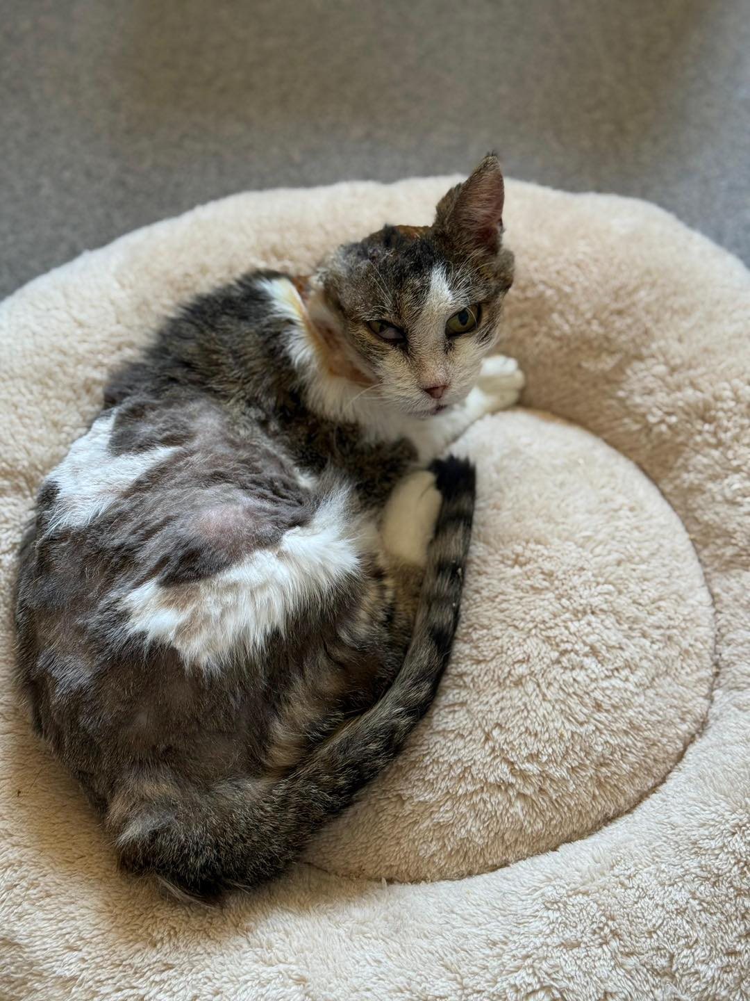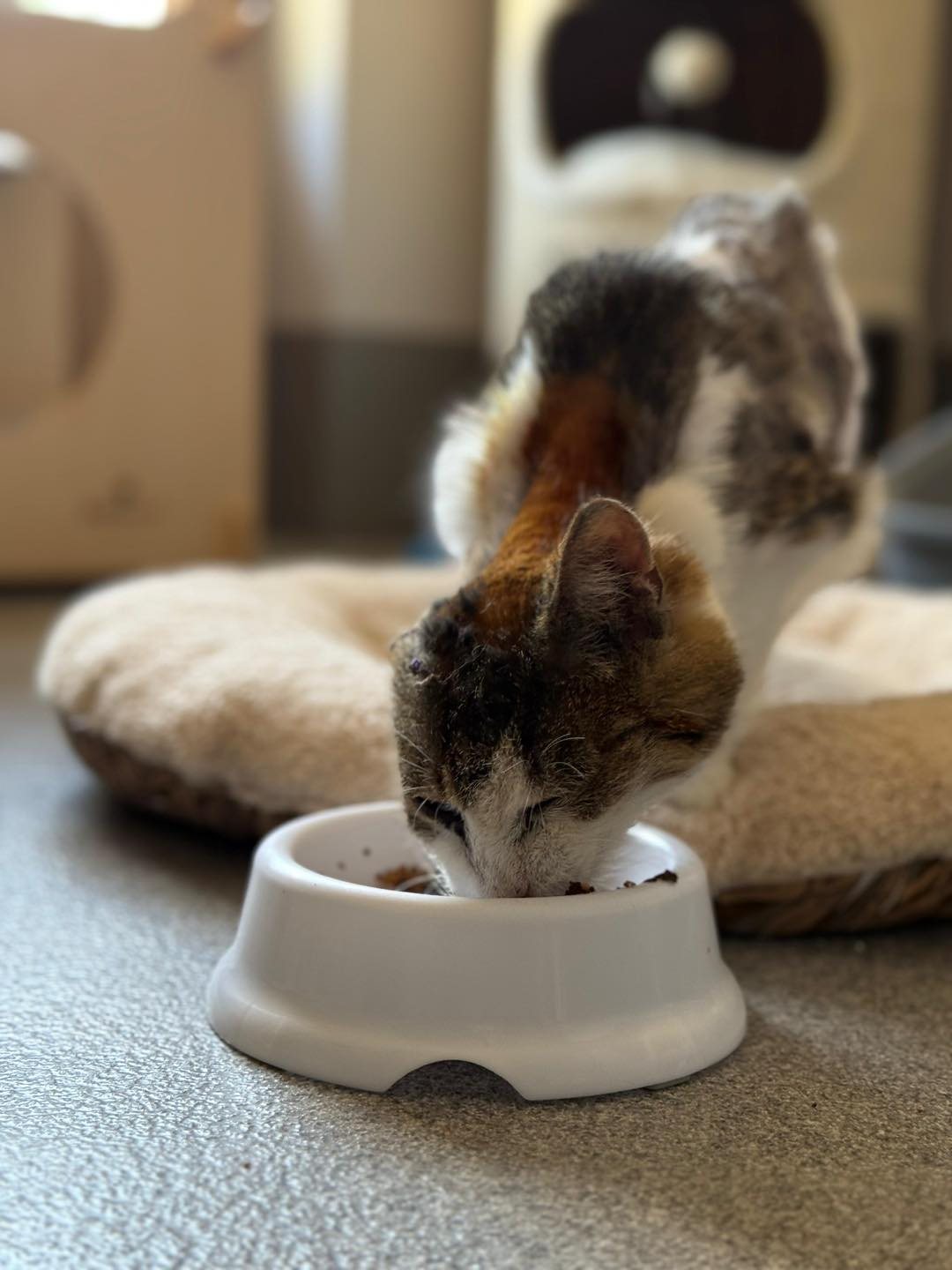 Terka powoli dochodzi do siebie. Futerko zaczęło już trochę odrastać, a – co bardzo nas cieszy – koteczce przez cały czas dopisuje ogromny apetyt 🥩. Kiedy czuje się nieco lepiej i nie odczuwa bólu, pozwala się pogłaskać i spokojnie przyjmuje naszą obecność. Tak toczy się teraz jej małe, codzienne życie – dzień po dniu, w spokoju i pod naszą uważną opieką 🤍.