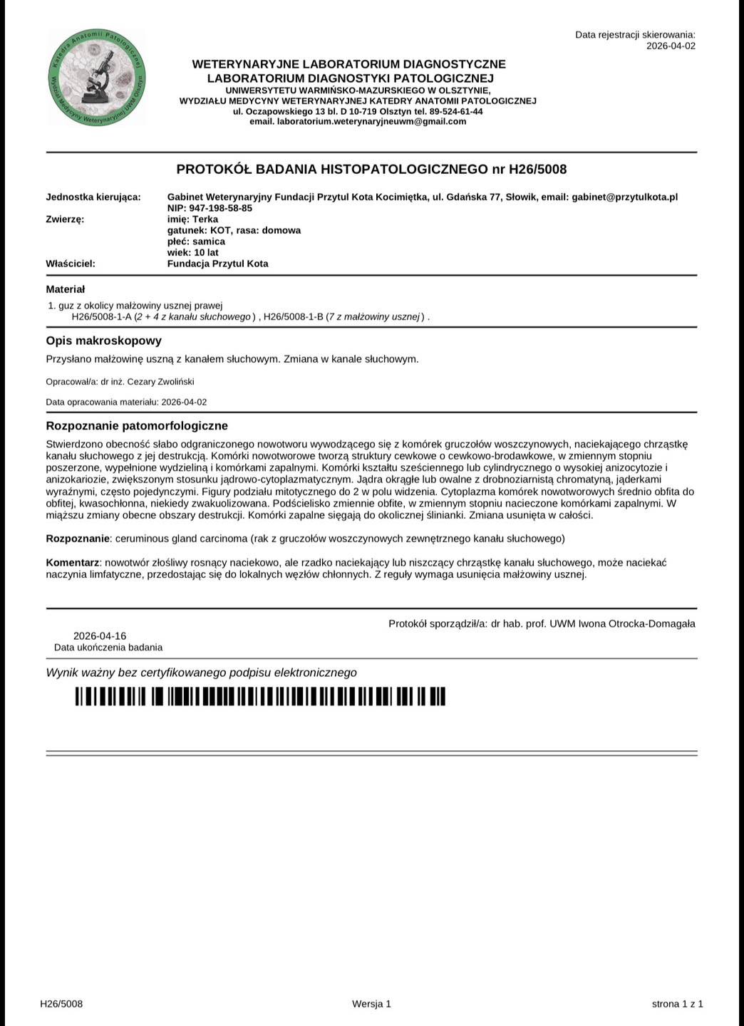 Jak pamiętacie, podczas operacji usunięty został guz wraz z całym prawym uszkiem. Tkanki zostały wysłane do specjalistycznego laboratorium, aby dokładnie sprawdzić, z jakim rodzajem zmiany mieliśmy do czynienia i czy udało się ją usunąć w całości 🔬.