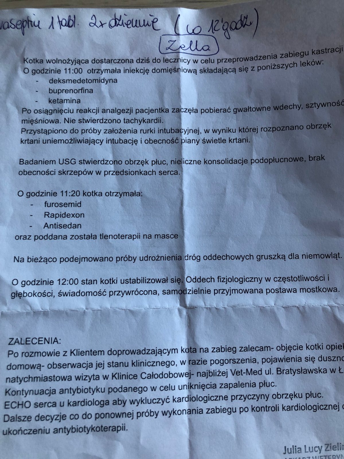 Echo nie wykazało przeciwwskazań, dlatego mogliśmy przystąpić do sterylizacji ✂️. Operacja przebiegła spokojnie i bez komplikacji. Dziś Zella jest już po kastracji, zaszczepiona, odrobaczona, z aktualnymi badaniami i ujemnymi testami – od strony medycznej mamy stabilizację i ogromną ulgę.